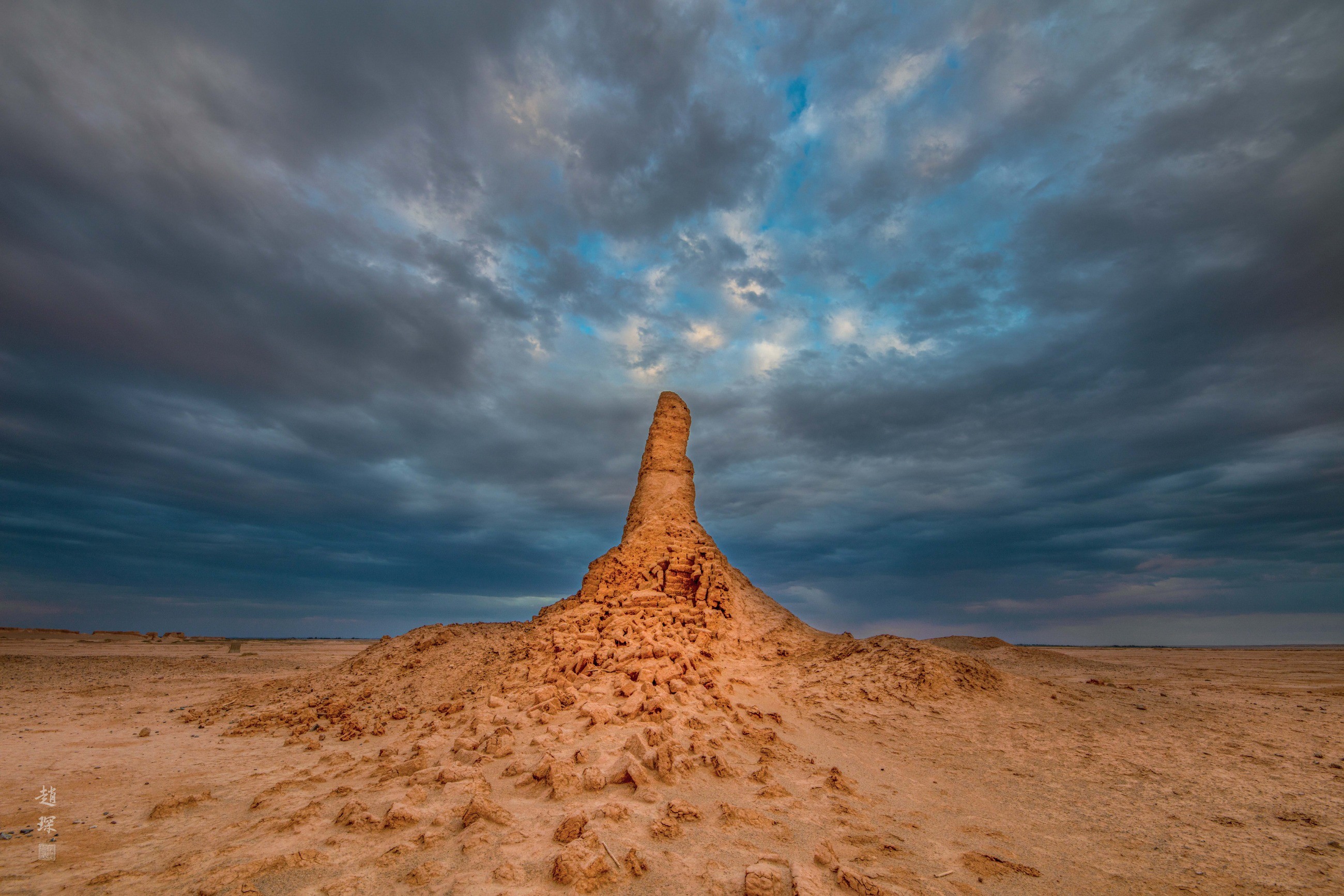 大漢雄風烽燧,位于甘肅與內蒙古無人區金塔縣,因長年風雨侵蝕四壁均酥堿坍塌脫落嚴重,有土坯暴露,其走勢依稀可辨風沙吹襲千載,留下的殘骸下寬上窄呈針形,依舊傲立挺拔,遙指天際。即使千年蝕骨磨滅了形,但傲骨猶存,雄風依舊,長城精神永存。
