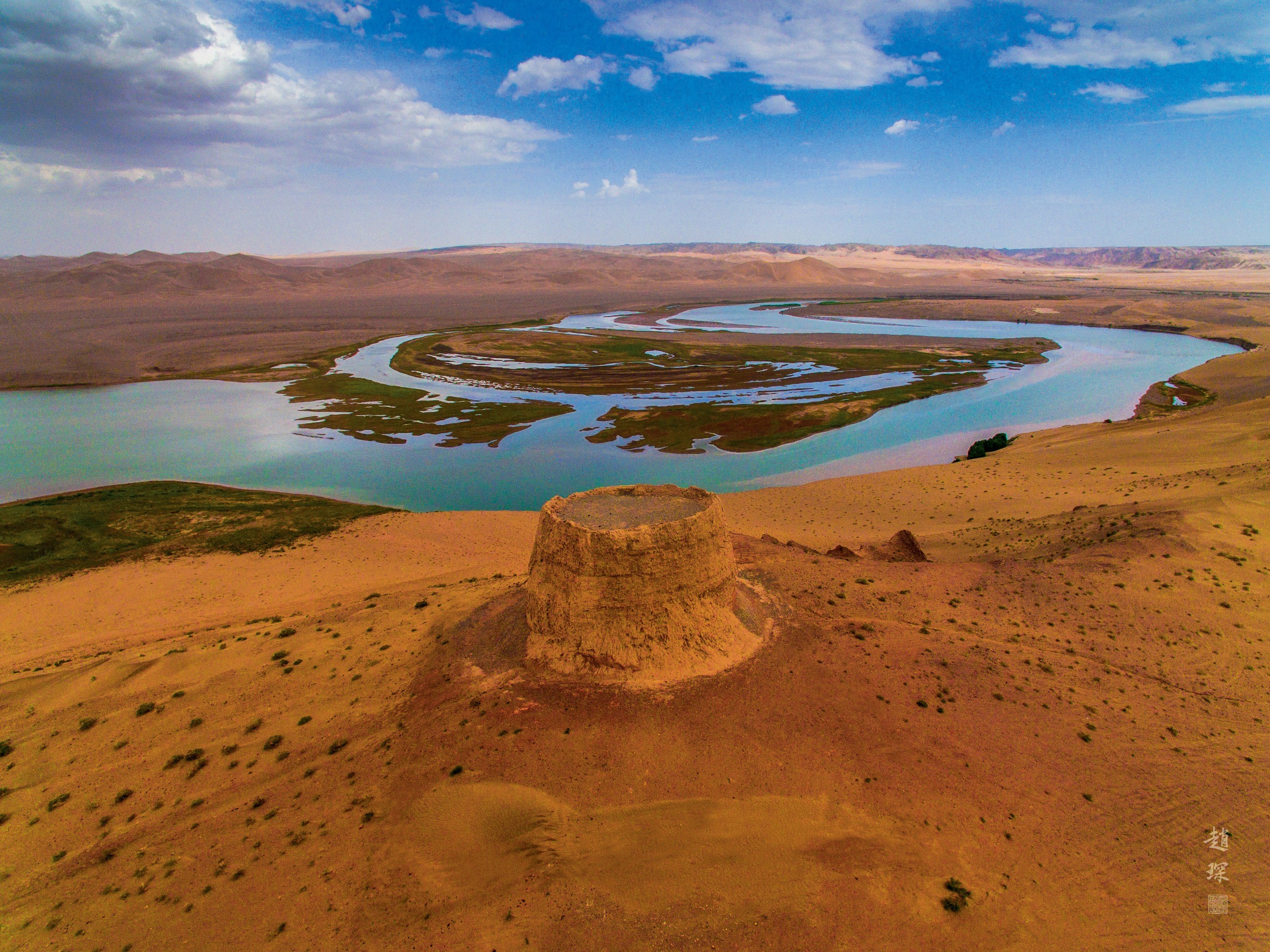 大墩門大墩,位于金塔縣鼎新鎮大茨灣村南約7公里的黑河西岸的高山頂上,仿佛同云層相接,烽燧底徑19.5米,高約11米,整體呈圓丘狀,大墩門大墩無論是從規模還是保存程度上看,在甘肅省內都是罕見的,堪稱"甘肅第一大墩"。