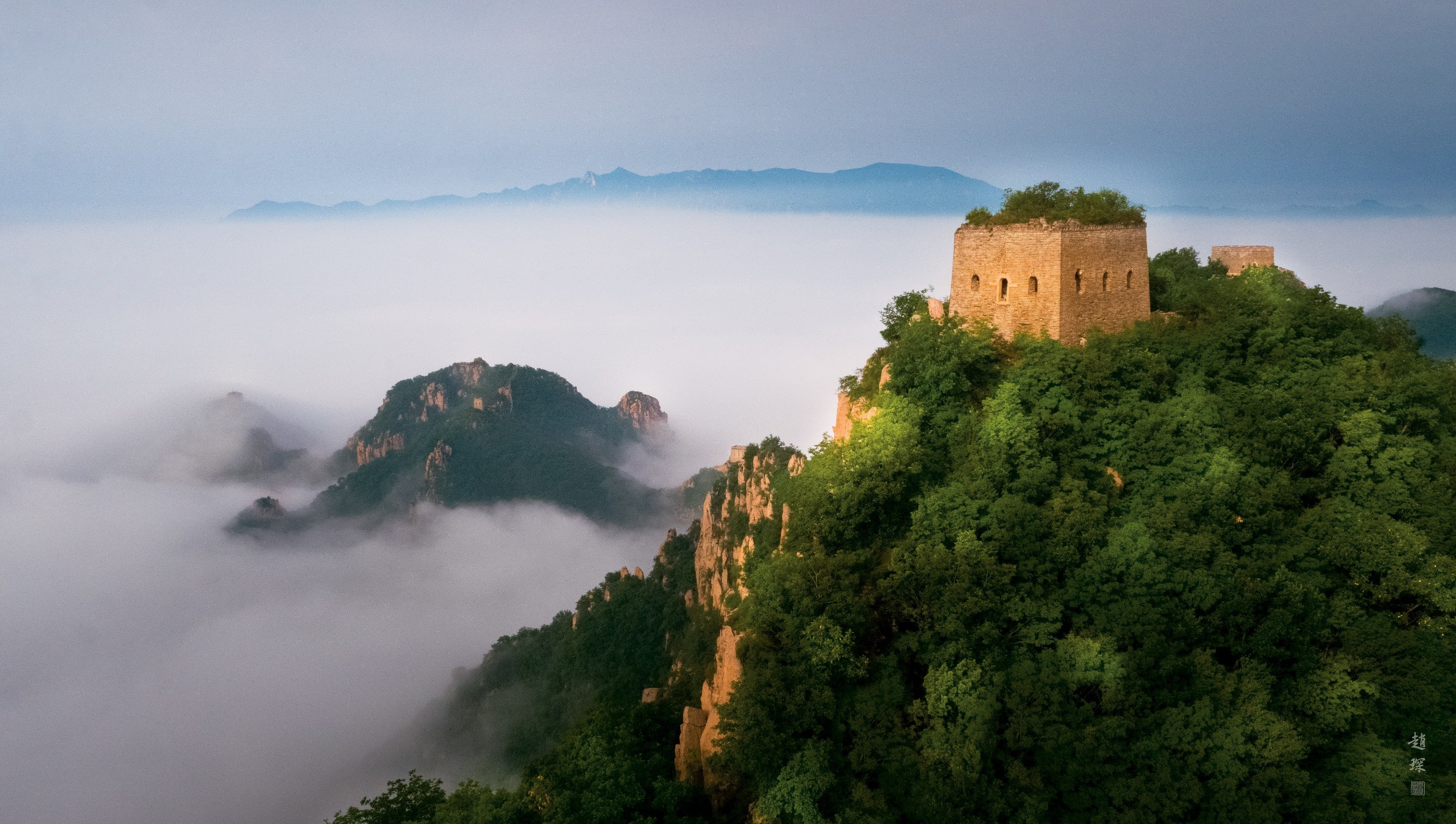京東第一樓,修建在巨大的火山口頂端,這也是板廠峪長城的地質特色之一—火山長城。此處易守難攻,據傳為將軍駐守的指揮樓。其內部構造與一般敵樓截然不同,中間貫通且寬闊;北側隔出三個單間;南側隔出兩個單間。照片中的京東第一樓正如一位將軍,從容不迫,坐看云卷云舒,感受滄桑巨變。